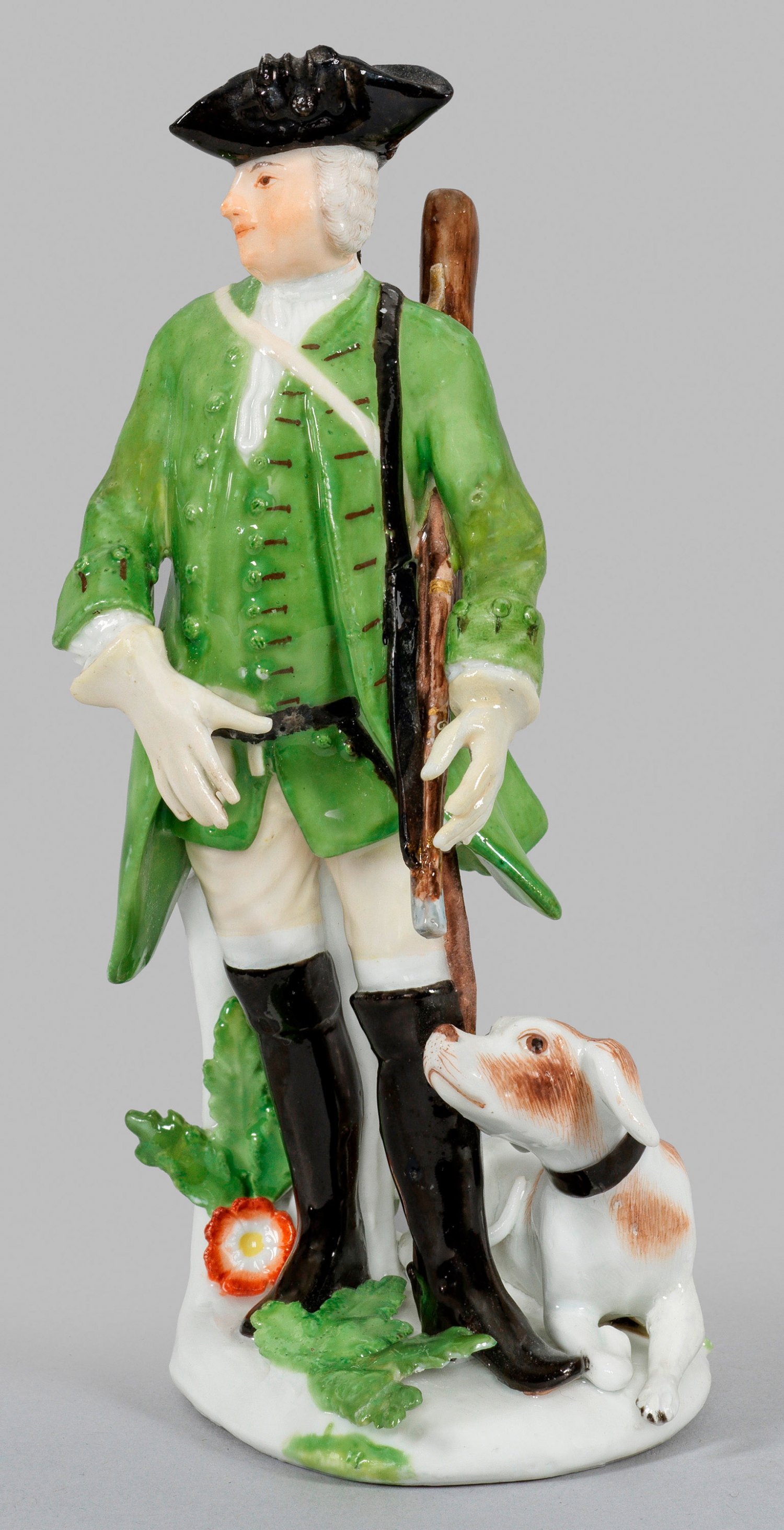 Auf einem mit plastischen Blüten und Blättern belegten Sockel stehender Jäger in hellgrünem Rock, zartgelber Hose und schwarzen Stulpenstiefeln. Das Haar von einem Dreizack bedeckt. Ein Jagdgewehr schulternd, auf dem Rücken eine Felltasche mit Rebhuhn tragend. Zu seinen Füßen sitzender Vorstehhund. Polychrome Malerei mit wenig Gold. Entw. wohl Johann Joachim Kaendler, 1744. Im Boden in purpurfarbener Aufglasur bez. "K.H.C." (Inventarmarke der Königl. Hofkonditorei). Rest.; Minim. best.; Schwertermarke. H. 14,5 cm.