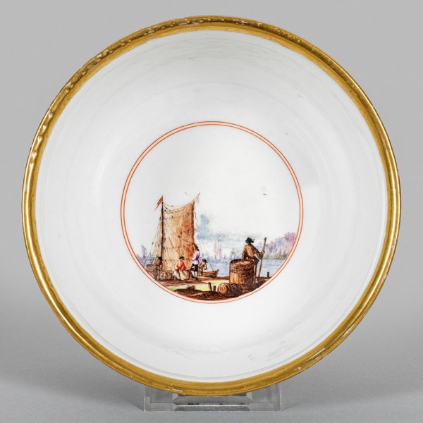 Auf kurzem Standring runder, leicht gebauchter, sich konisch erweiternder Korpus mit leicht ausschwingendem Rand. Beidseitig der Wandung in zartem Türkisfond ausgesparte, goldkonturierte Vierpassreserve. Darin Kauffahrteiszene mit an Flußufern angelegten Segelschiffen vor teilw. bergiger Landschaftskulisse mit großen Architekturen sowie Figurenstaffage. Im Spiegel der Kumme in eisenroter Doppelringlinie gerahmtes Medaillon mit korrespondierender Darstellung. Unw. rest.; Schwertermarke. H. 8 cm. D. 16,5 cm.