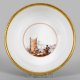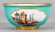 A turquoise ground porcelain rinsing bowl polychrome painted with Kauffahrtei scenes framed in gold-contoured quatrefoil cartouches. Insignificantly restored. Crossed swords mark.