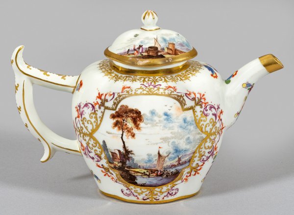 Vierpassig gewölbter Korpus mit eingezogener Schulter. Gebogter Röhrenausguss sowie J-förmig volutierter Henkel. Passig aufgewölbter, dazu passender Deckel mit Knospenknauf. Beidseitig der Wandung annährend formrezipierende, von Laub- und Bandelwerk gerahmte Goldornamentreserven mit Böttgerlüster. Darin niederländisch anmutende, architekturbestandene Hafenszenen mit Arbeitern in Booten und beim Anladen der Waren über eine Brücke mit Turm. Im Hintergrund weite Landschaft mit Windmühlen. Indianische Blütenzweige verstreut der Wandung. Auf dem Deckel vollflächiger korrespondierender Dekor. Feine polychrome Malerei wohl von Johann Georg Heintze. Formerzeichen für Andreas Schiefer. Vergolderzeichen. Rest.; Minim. ber.; Schwertermarke. H. 13,5 cm. L. 18,5 cm.