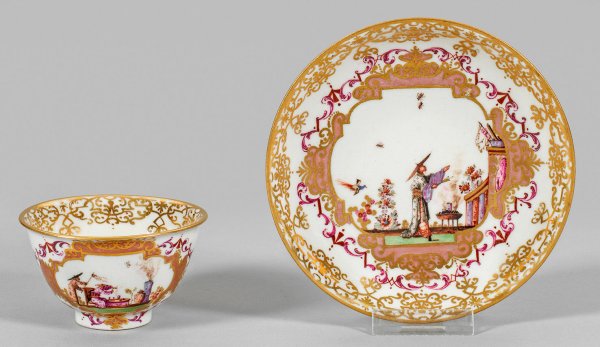 auf Unterschale. Leicht gebauchter, sich konisch erweiternder Korpus mit ausschwingendem Rand. Beidseitig der Wandung von eisenrotem und purpurfarbenem Laubwerk gerahmte, goldornamentierte Reserve mit Lüsterfond. Darin szenische Darstellung von Chinesen in blühender Gartenlandschaft. Auf der Schauseite ein sitzender, sich umwendender Chinese, in der rechten Hand einen goldenen Wimpel schwenkend. Vor ihm der zur Teezeremonie vorbereitete Tisch mit dampfender Teekanne. Hinter ihm stehender weiterer Herr mit großem Wagenradhut, einen Stock mit flatternden Bändern haltend. Rückseitig ein Mann in bodenlangem Gewand, das auf dem Tisch sitzende Tier dressierend. Korrespondierende Darstellung im Spiegel mit einem nahe einer rauchenden Feuerschale stehenden, festlich gekleideten Chinesen, sich mit erhobenen Armen einer Architektur mit Kolonnade mit marmorierten Säulen zuwendend. Äußerst feine, polychrome Malerei von Johann Gregorius Hoeroldt oder Werkstatt. Umlaufend breite Goldspitzenbordüre. Im Spiegel des Koppchens farbenprächtiges, von eisenroter Doppelringlinie gerahmtes Medaillon mit einem Chrysanthemen-Bukett im Kakiemonstil. Unterschale mit drei Ringlinien. Gold-Nr. 40. Meissen. Um 1723 - 1725. H. 4,5 cm.