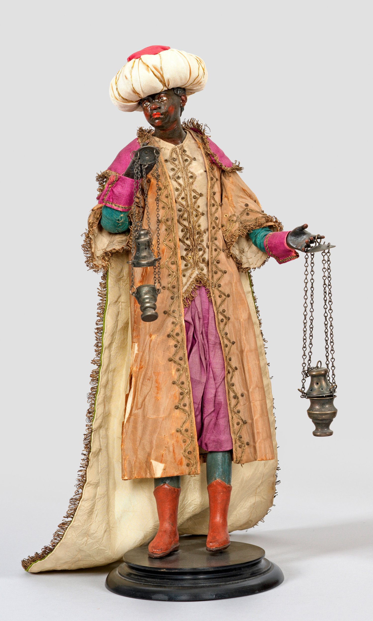 Caspar in prunkvollem Ornat mit Turban und langer Schleppe, zwei Weihrauchgefäße haltend. Terrakotta, farbig gefaßt, Glasaugen, Seidenstoffe mit reicher Brokatstickerei, Metall. Runder, ebonisierter Holzsockel, neuzeitlich. Ges.-H. 38 cm. Minim. Alters- und Gebrauchsspuren.