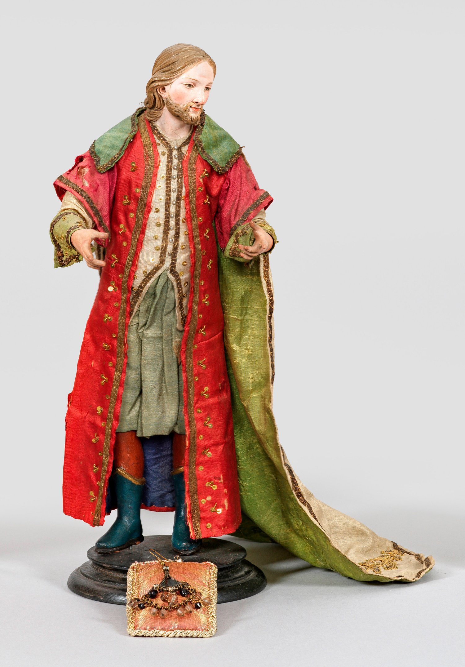 Weiser in Gestalt eines jungen bärtigen Mannes in aufwändigem Ornat mit langer Schleppe, dazu: Prunkkissen mit Vintage-Ohrgehänge (ergänzt). Terrakotta, farbig gefaßt, Glasaugen, Seidenstoffe mit Brokatstickerei, Metall, Schmucksteine. Runder, ebonisierter Holzsockel, neuzeitlich. Ges.-H. 34,5 cm. Minim. Alters- und Gebrauchsspuren.