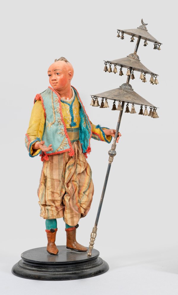 Page in Gestalt eines jungen Chinesen mit Haarschopf in prunkvoller orientalischer Tracht des 18. Jh., einen dreistufigen Zeremonienschirm mit zahlreichen Glöckchen und Halbmond-Bekrönung haltend. Terrakotta farbig gefasst, Glasaugen, Stoff, Metall. Runder, ebonisierter Holzsockel, neuzeitlich. Ges.-H. 32 cm. Minim. Alters- und Gebrauchsspuren.