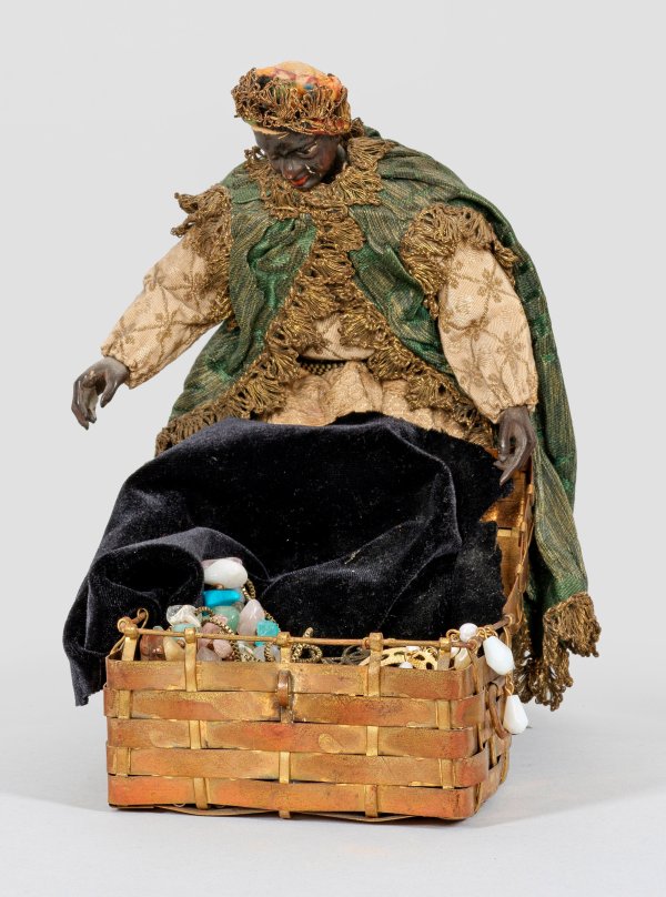 Neapolitan crib figure of Caspar. Painted terracotta, several other materials, embroidered fabric. Minor damaged/ signs of age and use. Trunk, jewelry and wooden base later.