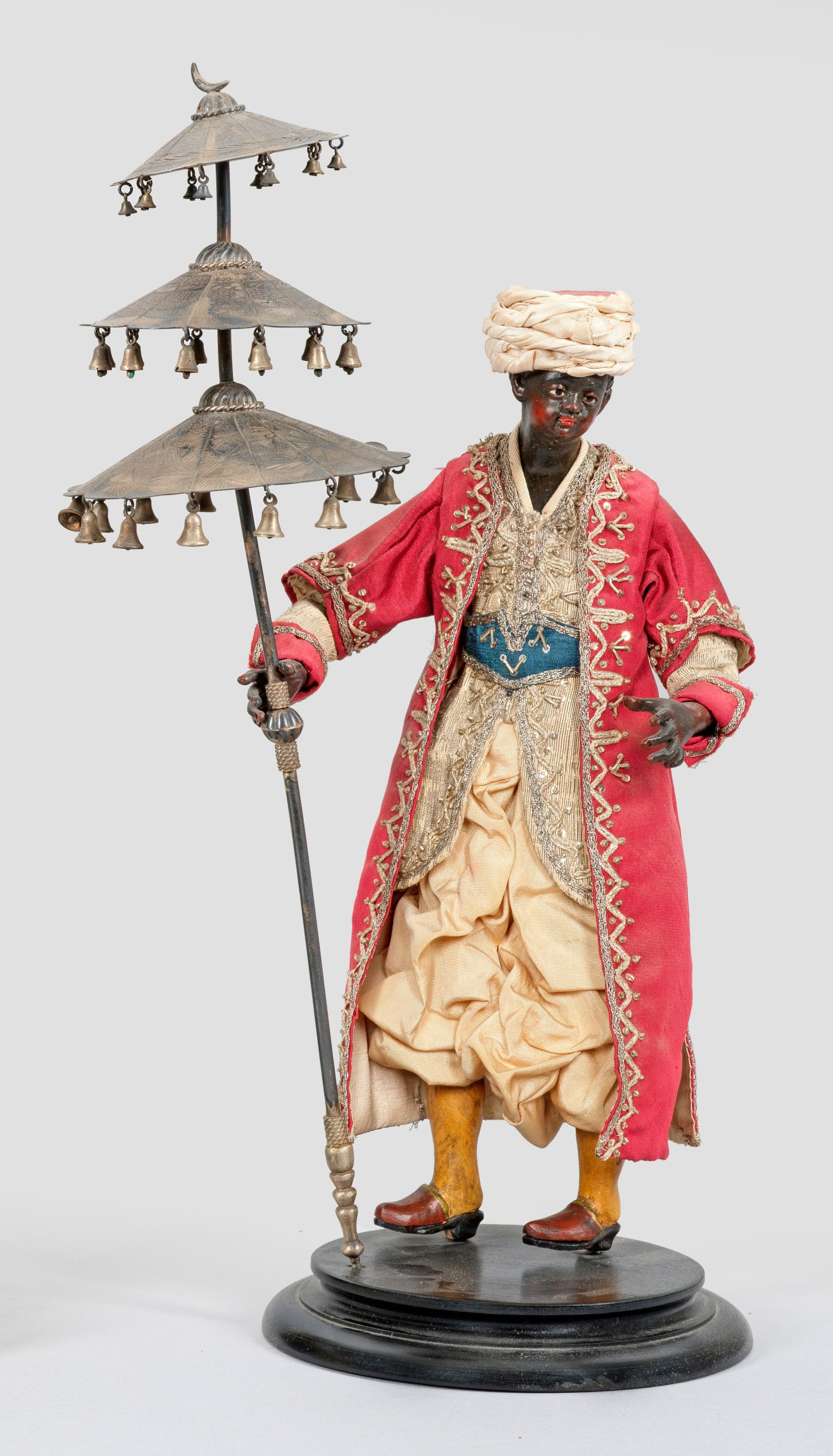 Junger Mann mit Turban in punkvoller orientalischer Tracht des 18. Jh., einen dreistufigen Zeremonienschirm mit zahlreichen Glöckchen und Halbmond-Bekrönung. Terrakotta farbig gefasst, Glasaugen, Seidenstoffe mit Brokat,- und Perlstickerei, Metall. Runder, ebonisierter Holzsockel, neuzeitlich. Ges.-H. 32 cm. Minim. Alters- und Gebrauchsspuren.