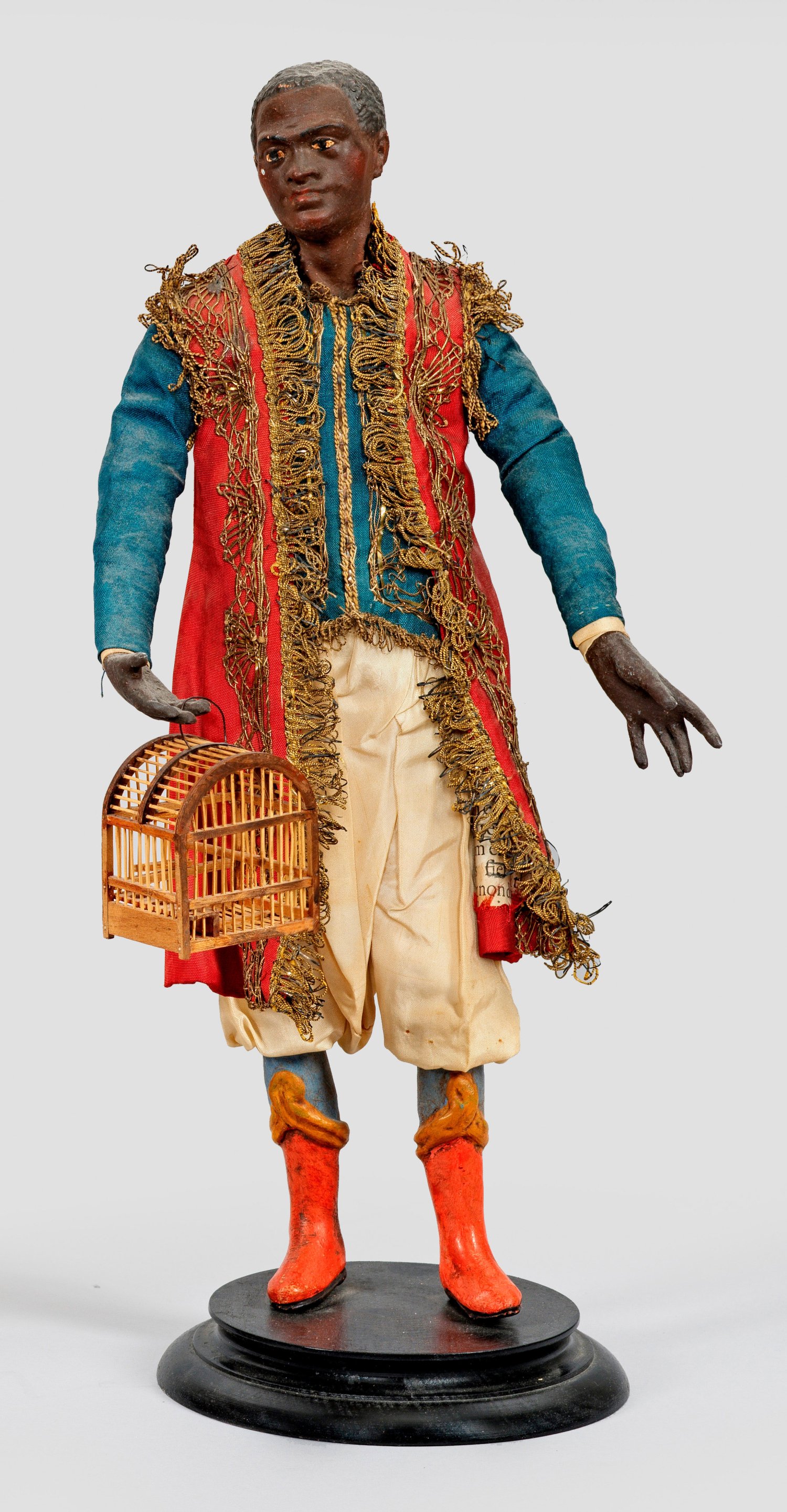 Neapolitan figure of a pageboy with a birdcage. Painted terracotta and wood, embroidered silk fabric. Minor signs of age and use.