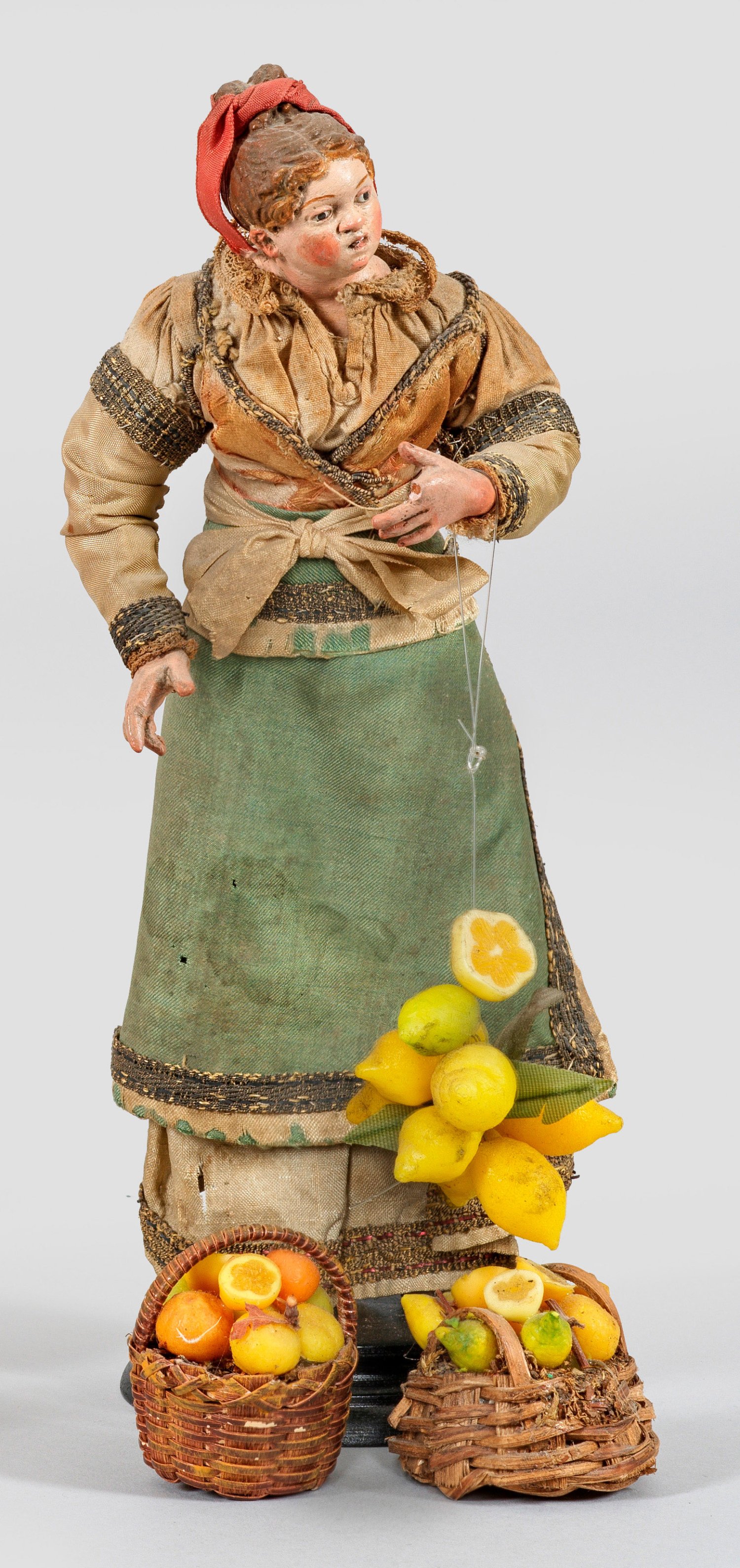 Neapolitan crib figure of a young peasant woman with a bundle of lemons and two baskets of citrus fruit. Painted terracotta, glass eyes, fabric, wicker, wax. Minor damaged/signs of age and use.