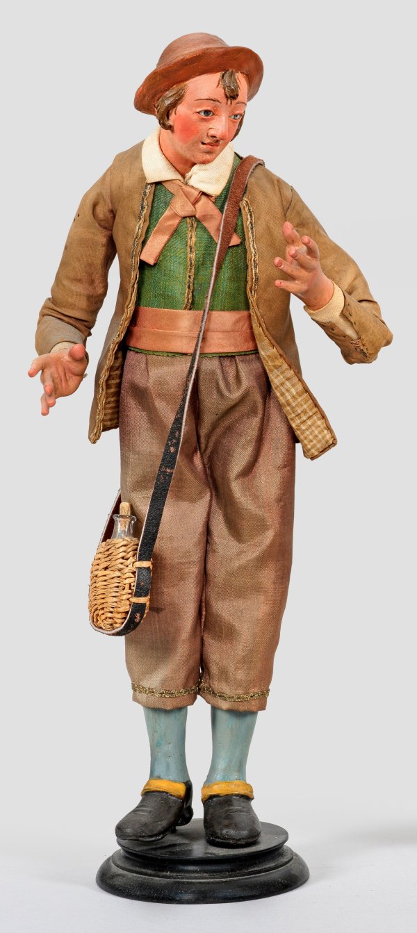 Mann mit halblangem, braunem Haar und kurzkrempigem Hut in schlichter, ländlicher Tracht, eine Feldflasche tragend. Terrakotta naturalistisch gefasst, Glasaugen, Seidenstoffe, Weide, Leder. Runder, ebonisierter Holzsockel, neuzeitlich. Ges.-H. 30 cm. Minim. Alters- und Gebrauchsspuren.