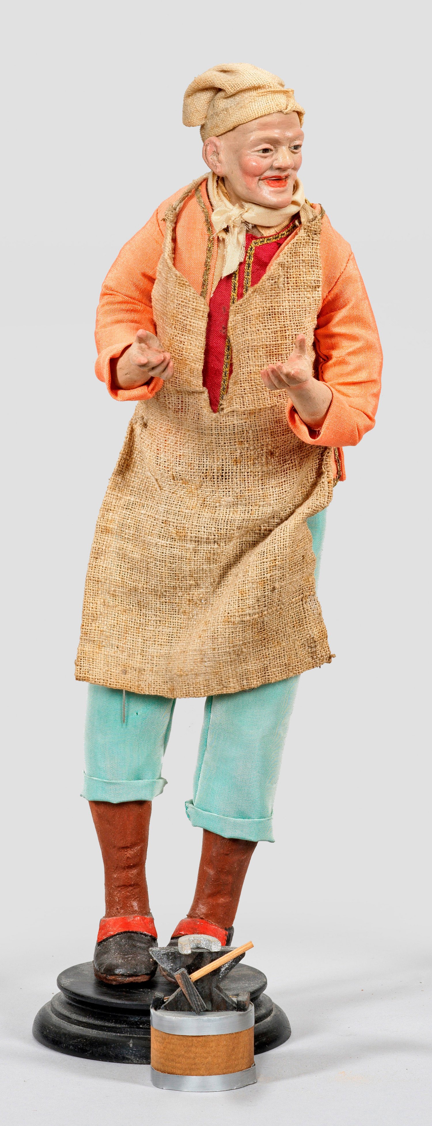 Alter Mann mit ausdrucksstarkem, lächelndem Gesicht, eine Mütze und Schürze tragend, dazu: Amboss mit Hammer und Hufeisen (ergänzt). Terrakotta farbig gefasst, Glasaugen, Holz, Metall. Runder, ebonisierter Holzsockel, neuzeitlich. Ges.-H. 26,5 cm. Bekleidung teilw. später. Minim. Alters- und Gebrauchsspuren.