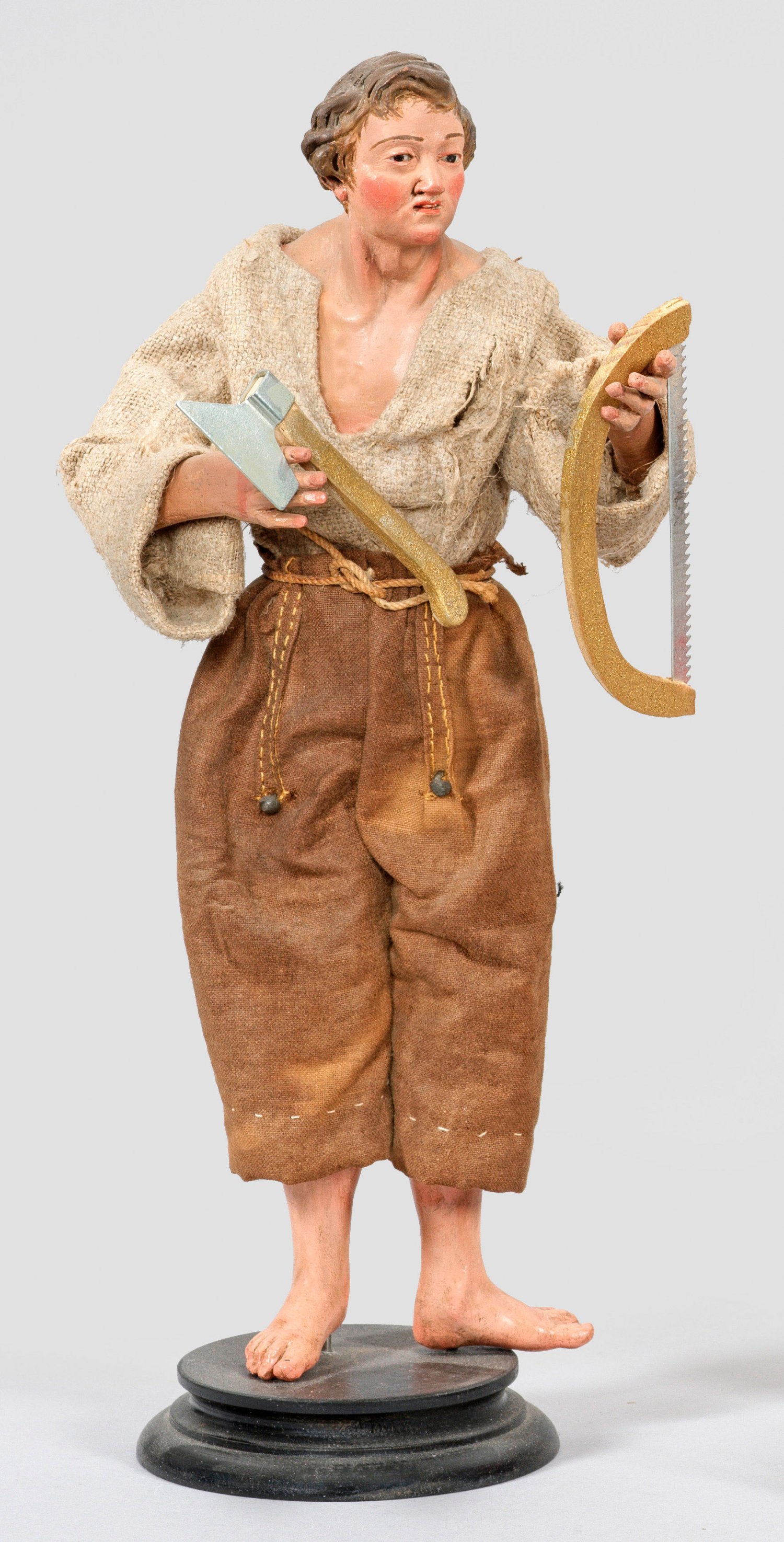 Neapolitan crib figure of a Neapolitan young carpenter with a saw and a hatchet. Painted terracotta, glass eyes, materials, embroidered silk fabric, wood, metal. Tools and wooden base later. Minor signs of age and use.