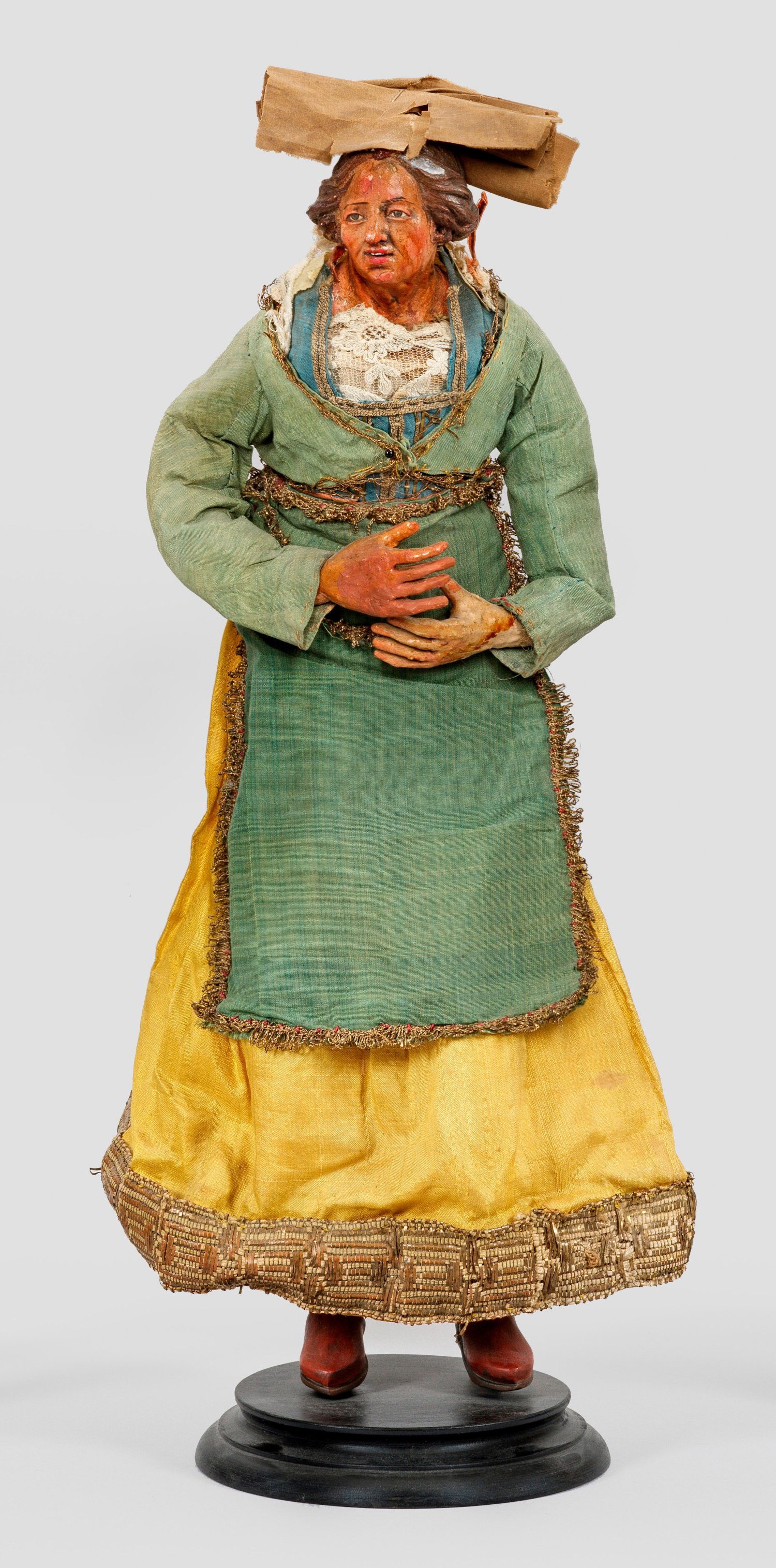 Large Neapolitan crib figure of a peasant woman. Painted terracotta, wood, glass eyes, embroidered silk fabric. Wooden base later. Minor restored/signs of age and use.