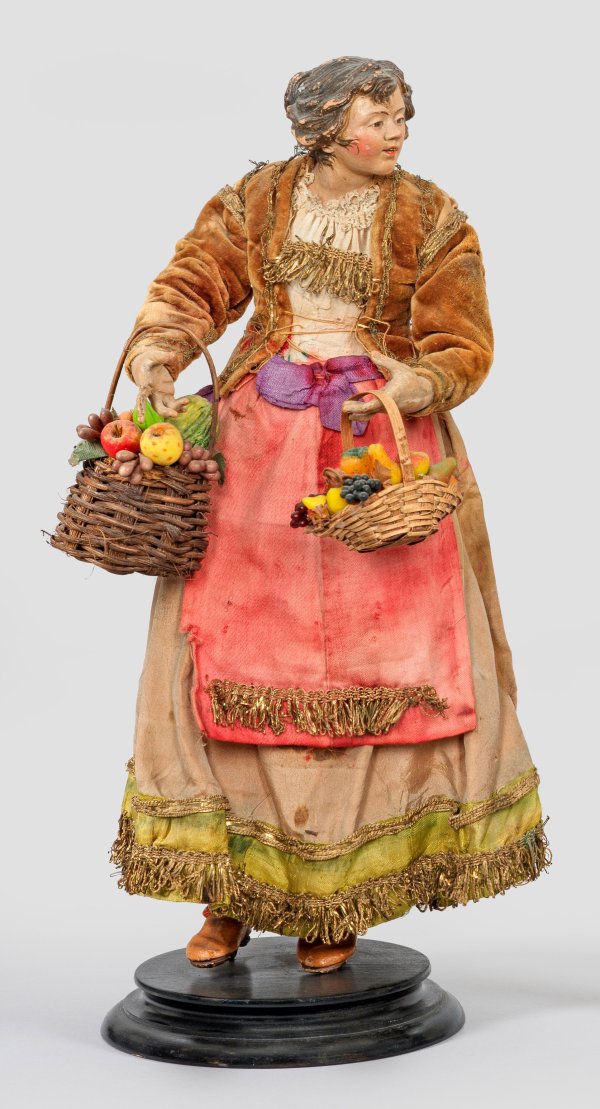 Neapolitan crib figure of a young peasant woman with two richly filled fruit baskets. Painted terracotta, glass eyes, embroidered velvet, silk fabric, bast, wax. Wooden base later. Minor signs of age and use.