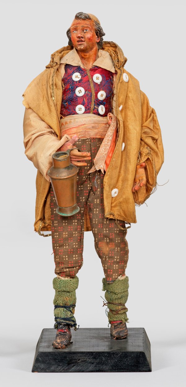 Large Neapolitan crib figure of a landlord holding a copper jug. Painted terracotta, glass eyes, embroidered fabric, buttons, copper. Wooden base later. Minor signs of age and use.