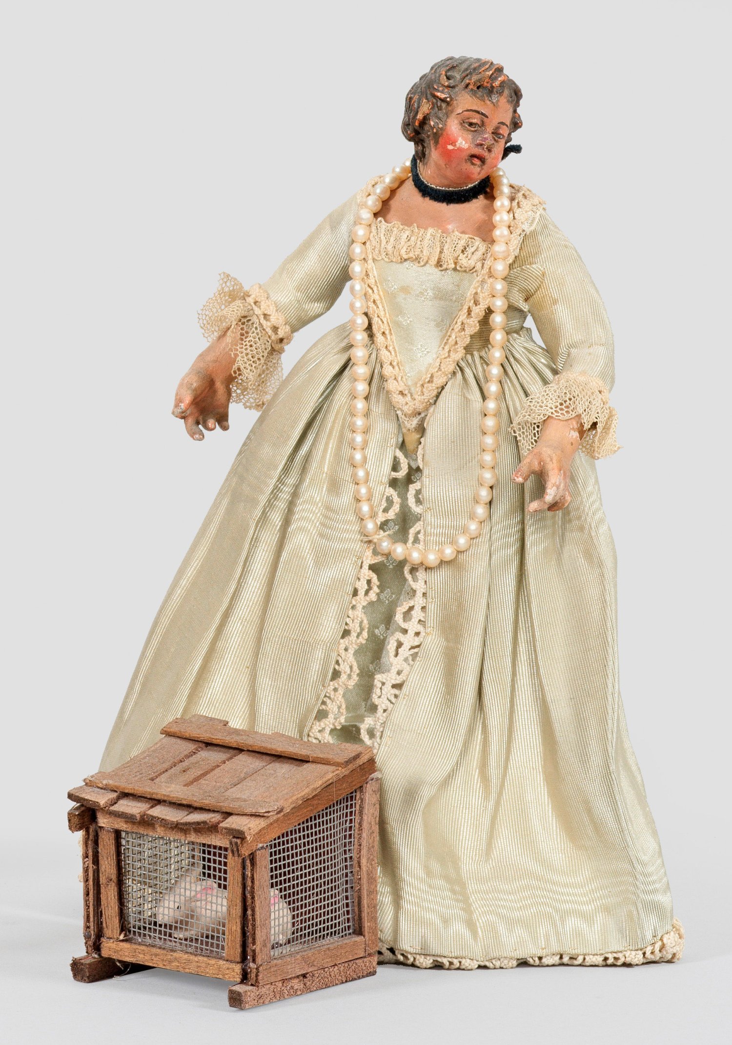Junge Frau in einer eleganten Robe à l'anglaise des 18. Jh.; dazu: Miniatur eines Hasenstalls, Kunstperlkette. Terrakotta farbig gefasst, Glasaugen, Seidenstoff, Klöppelspitze, Holz, Draht. Runder, ebonisierter Holzsockel, neuzeitlich. Ges.-H. 20,5 cm. Minim. besch./Alters- und Gebrauchsspuren.