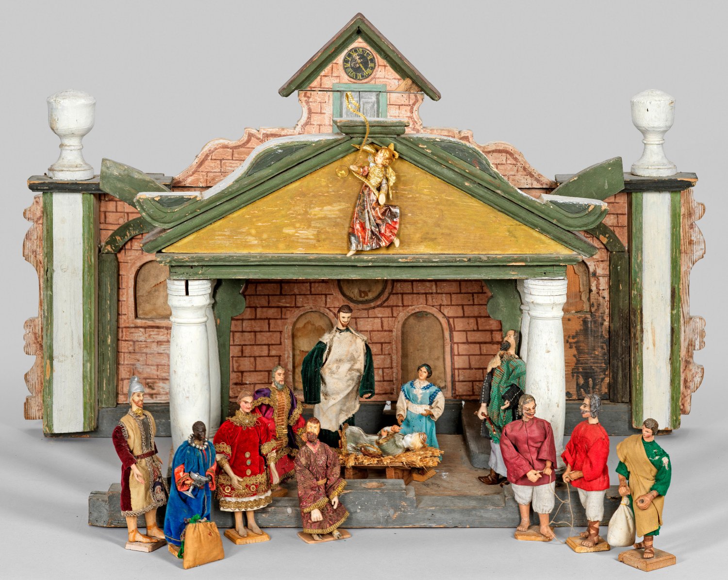 Hölzernes, bemaltes Gebäude mit Säulen, Vasen und Backsteindekor. Figuren, darunter die Heiligen Drei Könige, Maria und Joseph, ein römischer Soldat und ein Verkündigungsengel, teilw. Terrakotta naturalistisch gefasst oder Kunststoff. In verschiedene Stoffe gewandet, teilw. auf Holzsockeln. Teilw. besch.; Ges. -H. 72 cm.