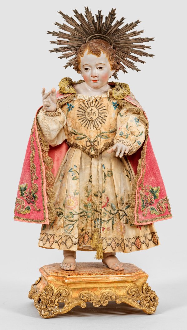Auf mit Blüten, Früchten und Voluten verziertem Sockel stehendes Christuskind in aufwändiger Kleidung mit Blumenstickerei, Pailettenbesatz und rüschengesäumtem Umhang sowie vielstrahligem Heiligenschein aus Silber. Terrakotta, naturalistisch gefasst, hintermalte Glasaugen, verschiedene Materialien und Stoffe. Leichte Spuren von Alter und Gebrauch/rest.; H. 59 cm.