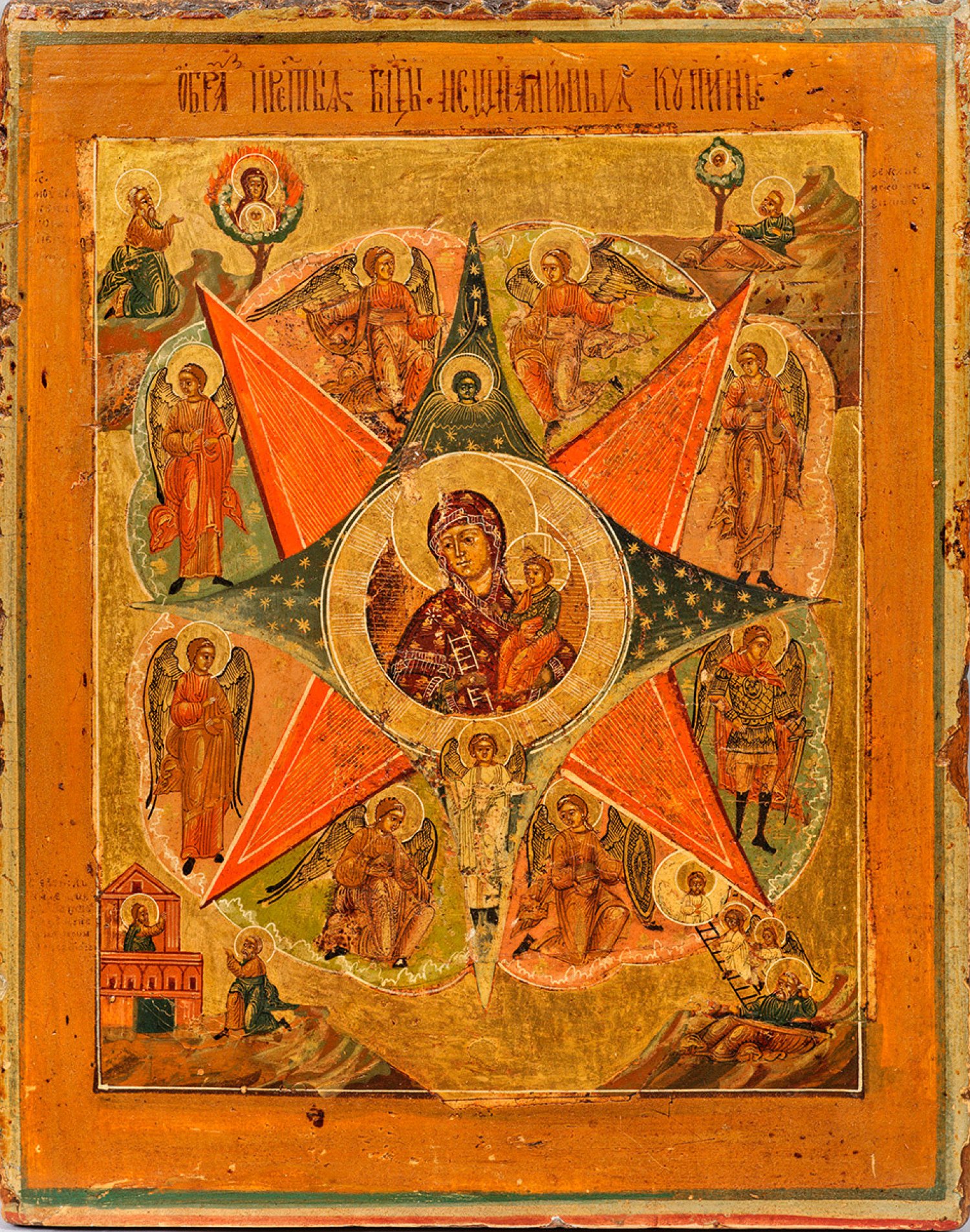 Tempera und Gold auf Holz. 2 rücks. Sponki. Die alttestamentliche Erzählung des unverbrennbaren Dornbusches, den Moses sah und aus dem der Engel des Herrn zu ihm sprach, gilt als Prophezeiung der Jungfräulichkeit Mariens. Im 16. Jh. entwickelte die russische Ikonenmalerei hierzu ein komplexes Motiv: Die Gottesmutter mit dem Kind im Zentrum eines aus zwei konkaven Vierecken gebildeten Sterns, der von einer achtpassigen Rosette eingefasst wird. In den einzelnen Bildfeldern sind Evangelisten und Engel wiedergegeben und die Ecken bilden vier alttestamentliche Erzählungen ab, die als biblische Weissagungen der Jungfräulichkeit Mariens verstanden werden. Kirchenslawisch bez.; 34,5 cm x 26 cm x 3 cm.