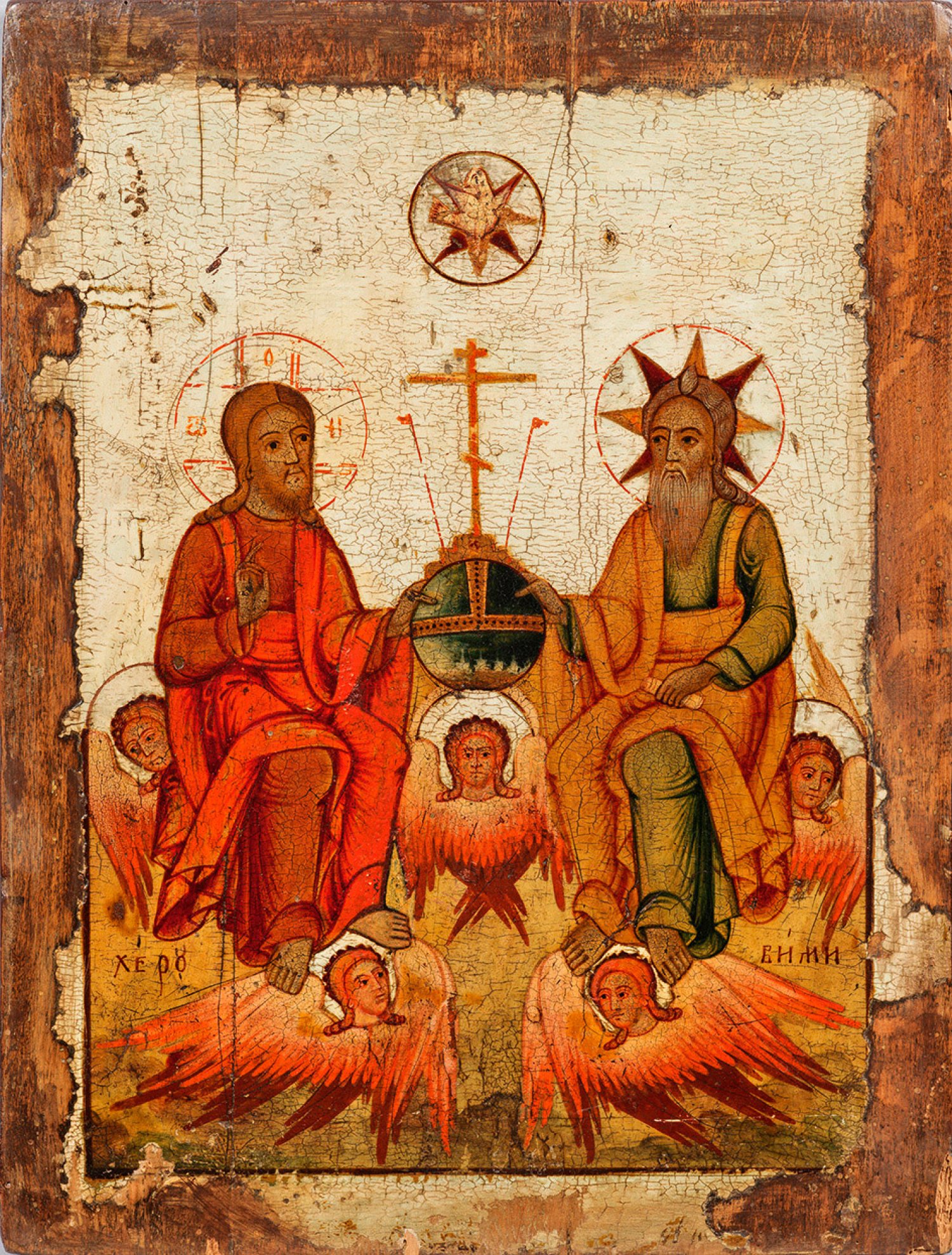 Tempera auf Holz. Kowtscheg. 2 rücks. Sponki. Im leicht vertieftem Mittelfeld sitzender Gottvater, mit weißem Haupt- und Barthaar und Christus als junger Mann auf einer Wolkenbank, die von Cherubim getragen wird, den göttlichen Begleitern, die von Gottes Gegenwart kündigen. Im Zentrum halten Vater und Sohn einen prächtigen Reichsapfel als Zeichen Ihrer Allmacht, darüber schwebt der Heilige Geist in Gestalt einer weißen Taube. Die Heilige Dreifaltigkeit gilt als die grundlegende und wichtigste Lehre der christlichen Kirchen. In ihr vereint sind Gott der Vater als der Schöpfer des Himmels und der Erde, Jesus Christus, der als Botschafter zu den Menschen entsandt wird, und der Heilige Geist, der den Jüngern Jesu zuteil wird, damit diese die offenbarten Wahrheiten verstehen und bezeugen. Kirchenslawisch bez.; 42 cm x 31,5 cm x 2,5 cm.