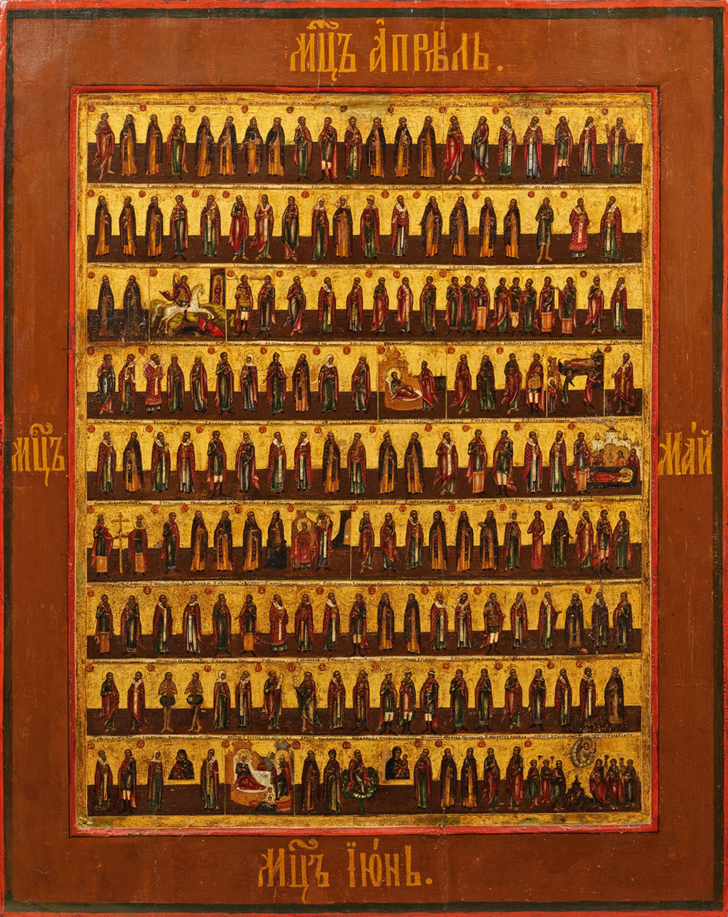 Tempera mit Goldgrund auf Holz. Kowtscheg. Zwei rücks. Sponki. In neun Reihen zahlreiche Darstellungen der Heiligen, Namenspatronen und Festtagen der Monate April, Mai und Juni. Kirchenslawisch bez.; 70,5 cm x 56,5 cm x 3 cm.