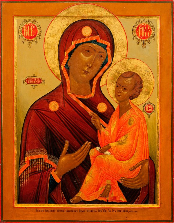 Tempera mit Gold auf Holz. Kowtscheg. 2 rücks. Sponki. Auf leicht vertieftem Mittelfeld die halbfigurige Darstellung der Gottesmutter in rotem Maphorion mit den drei Jungfrauensternen. Leicht nach rechts gewandt, weist sie mit ihrer Rechten auf den Christusknaben, den sie in ihrem linken Arm hält. Der Knabe hat seine Rechte zum Segensgruß erhoben, während seine Linke eine kleine Schriftrolle festhält. Das große Format dieser Ikone verweist darauf, dass es sich hier um ein Werk aus dem Register einer Kirchenikonostase handelt. Kirchenslawisch bez.; 89,5 cm x 71 cm x 3,5 cm.