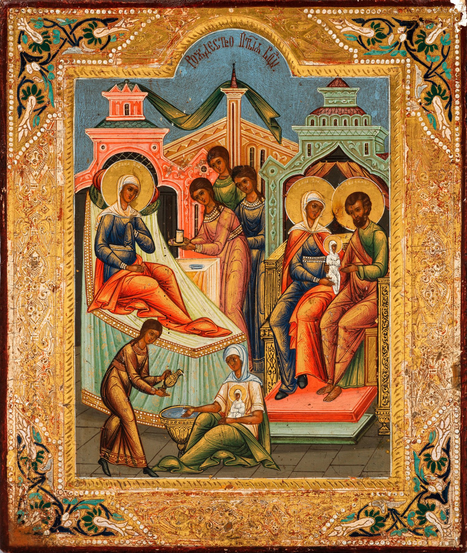 Tempera und Vergoldung auf Holz, zwei Rückseiten-Sponki. Fein gemalte Darstellung der Heiligen Anna im Kindbett, der sich drei Dienerinnen nähern, rechts ihre Eltern Joachim und Anna auf einem Thron sitzend mit Maria, unten die Hebamme mit dem Neugeborenen. Der vergoldete Rand in der Art von Cloisonné-Email gestaltet. Randvergoldung ber.; 31 cm x 26,5 cm.