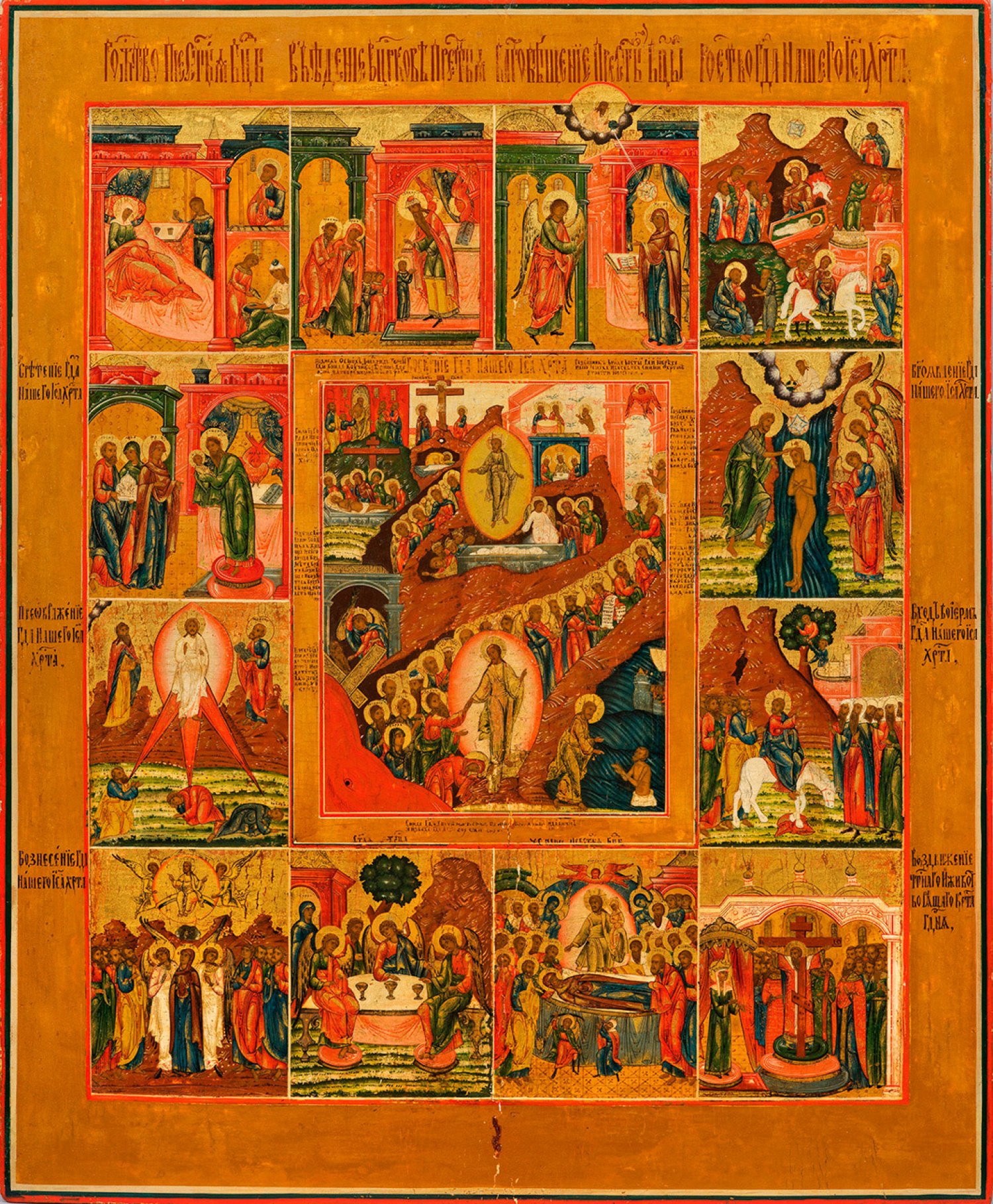 A very large Russian icon showing the descent to hell, the resurrection and twelve major lithurgical feasts. Tempera with gold on wood.
