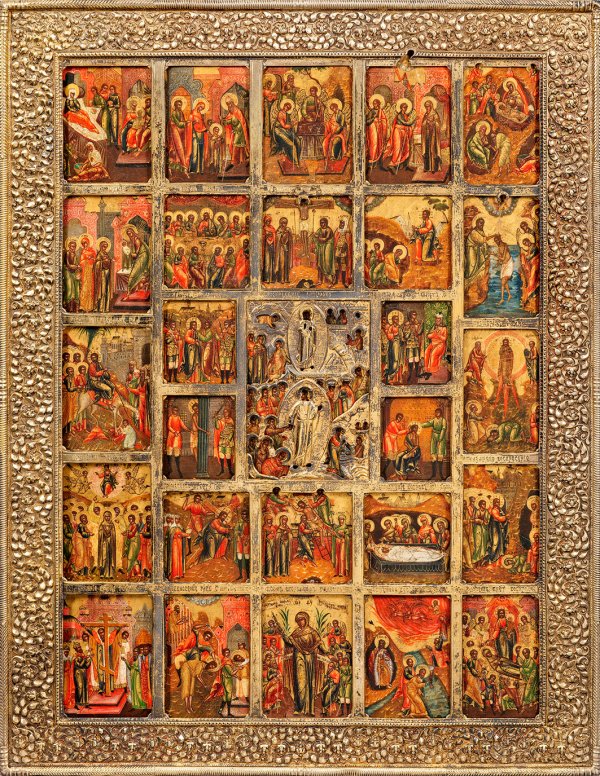 A large Russian icon with the resurrection and descent with passion and sixteen major feasts. Tempera with gold on wood. Gilded silver oklad, assay mark of A. Romanov, Moscow 1890, master Yakov Fedorovich Mishukov.