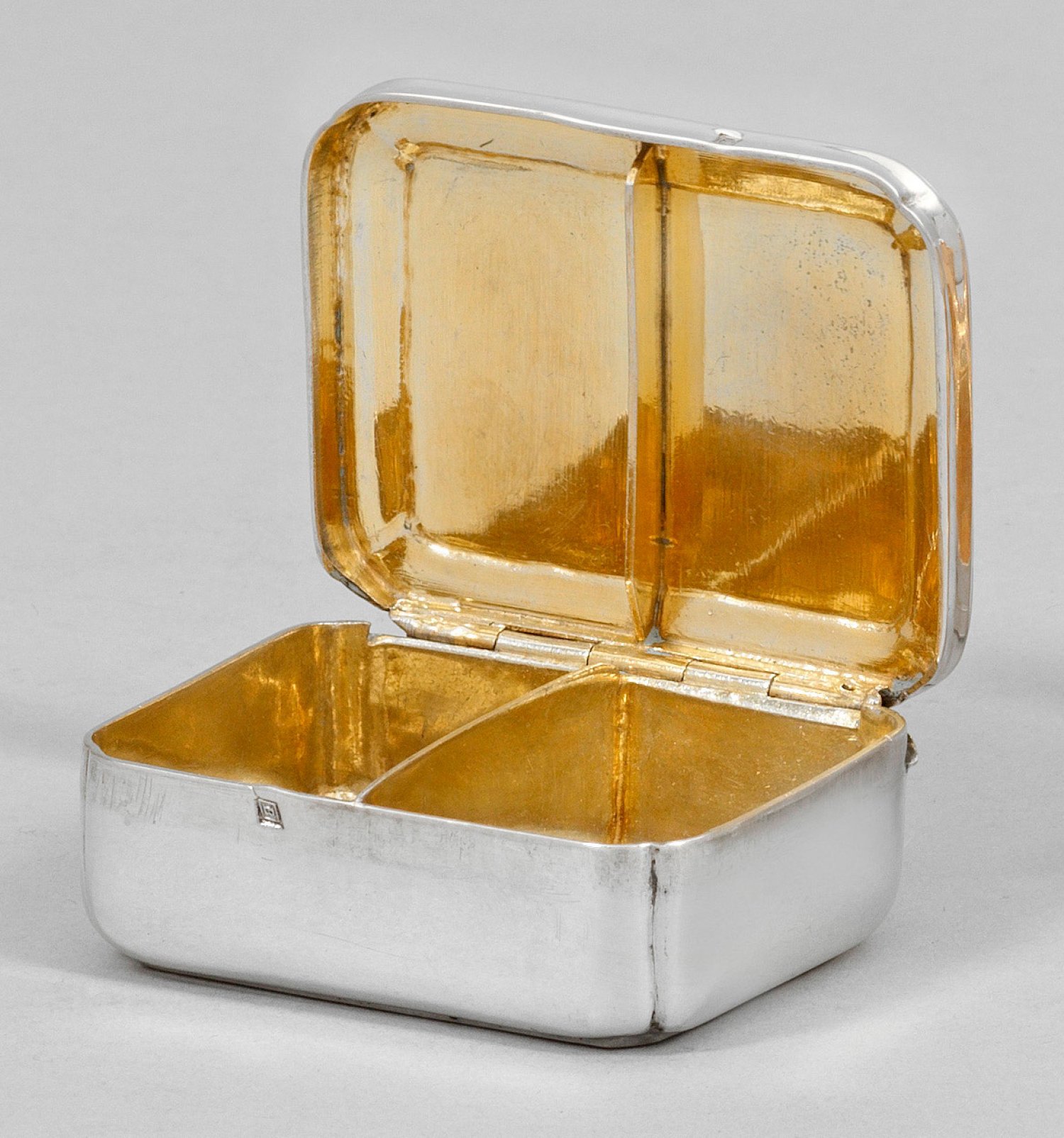 Silber. Rechteckiger Korpus mit gerundeten Ecken und rücks. scharniertem Deckel. Innen vergoldet, mit mittiger Trennwand. Gest. Beschauzeichen, Meister Anton Meixner (wird Meister 1785), Repunzierung für Österreich, Prag, 1806. Gew. 70 g.; L. 5,5 cm.