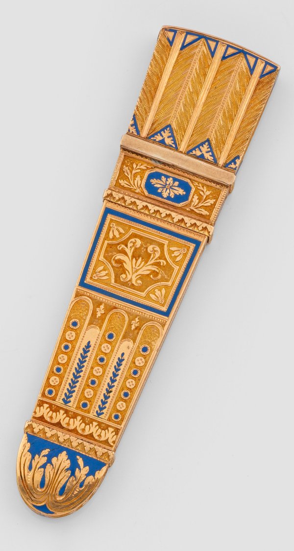 Gelbgold, 18 ct., teilw. emailliert. Rechteckiger, konischer Korpus und Deckel mit gerundeten Enden. Deckel und Abschluss mit Profilfriesen umzogen. Wandung unterteilt in Kartuschen mit botanischen und geometrischen Elementen, teilw. himmelblau emailliert. Minim. best.; Gest. unidentifiziertes Meisterzeichen. Ges.-Gew. 21,08 g. 8,1 cm x 1,8 cm.