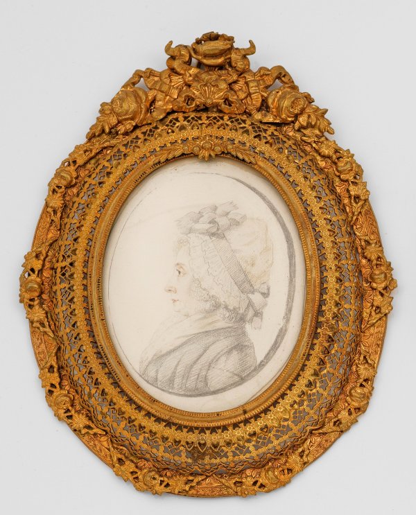 Ovales Brustbild einer Dame mit Spitzenhaube im Profil. Bleistift auf Papier mit Kreidegrund. Ges.-H. 15 cm. Rahmen mit Hängeöse.
