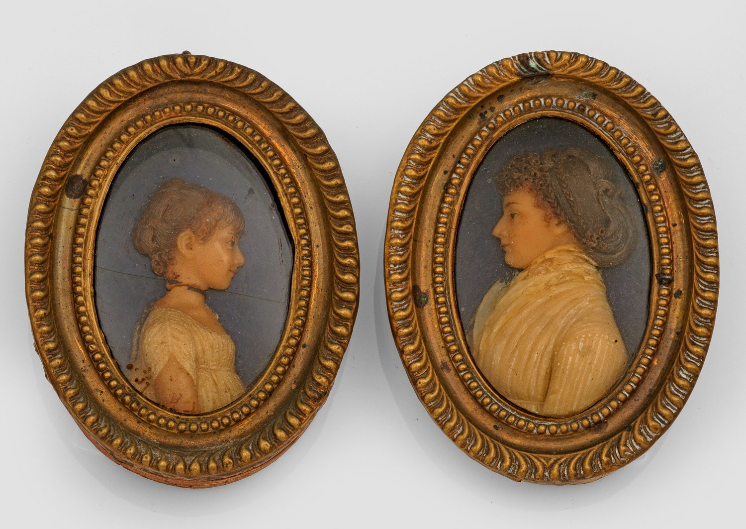 Gegenstücke. Naturalistisch gestaltete, polychrom gefasste, reliefierte Wachsbossierungen auf blauem Grund. Im Profil dargestellt ein Mädchen und eine junge Frau im weißen Kleid. Verso bez. "Dorothee de Dobbeler (1787 - 1865)" und "Henriette de Dobbeler (1791 - 1844)". Teilw. besch.; H. 7,5 cm. Montiert in ovalen Messingrahmen unter Glas.