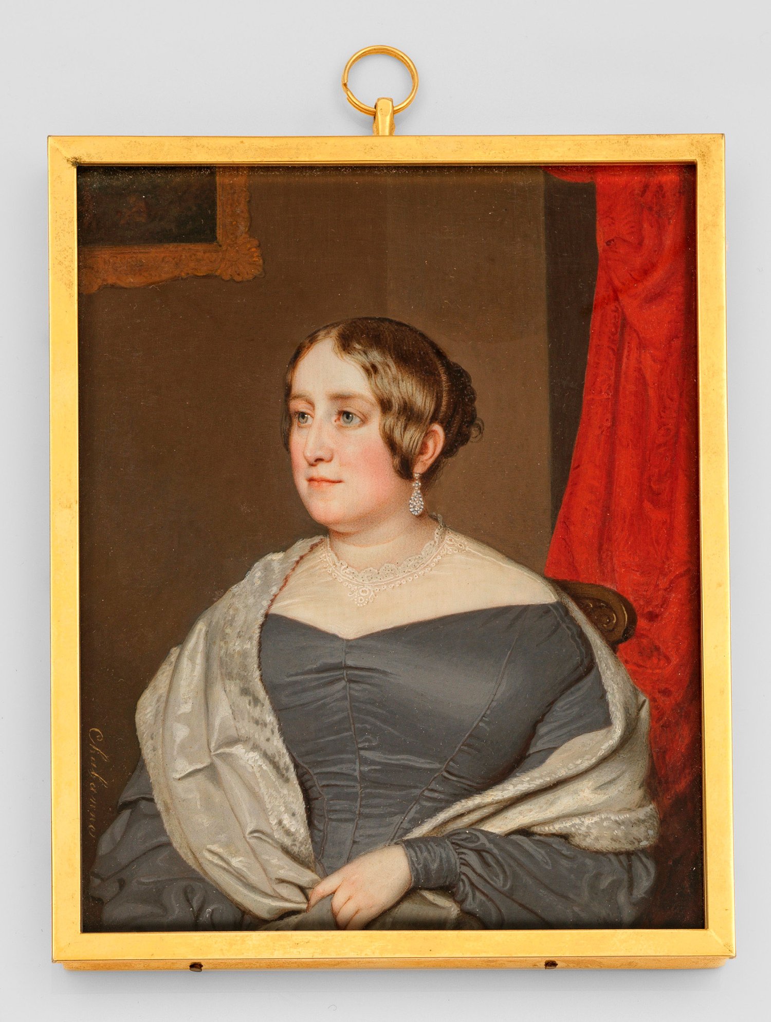 Halbfigurige Porträtdarstellung einer jungen Frau in grau-weißem Kleid mit Spitzenkragen, pelzverbrämter Stola und perlenbesetztem Ohrring. Im Hintergrund ein roter Vorhang und die Ecke eines goldenen Bilderrahmens vor einer braunen Wand. Tempera/Elfenbein. Sign. "Chabanne". H. 13 cm. Messingrahmen.