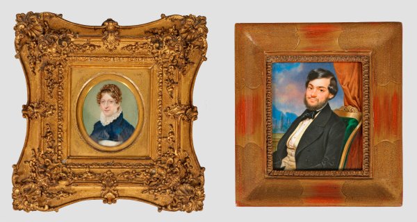 Brustbild einer Dame in blauem Kleid und halbfigurige Darstellung eines sitzenden Mannes im dunklen Gehrock vor weiter Landschaft. Tempera/Elfenbein. Ber.; 7,5 cm - 11,5 cm. Rahmen.