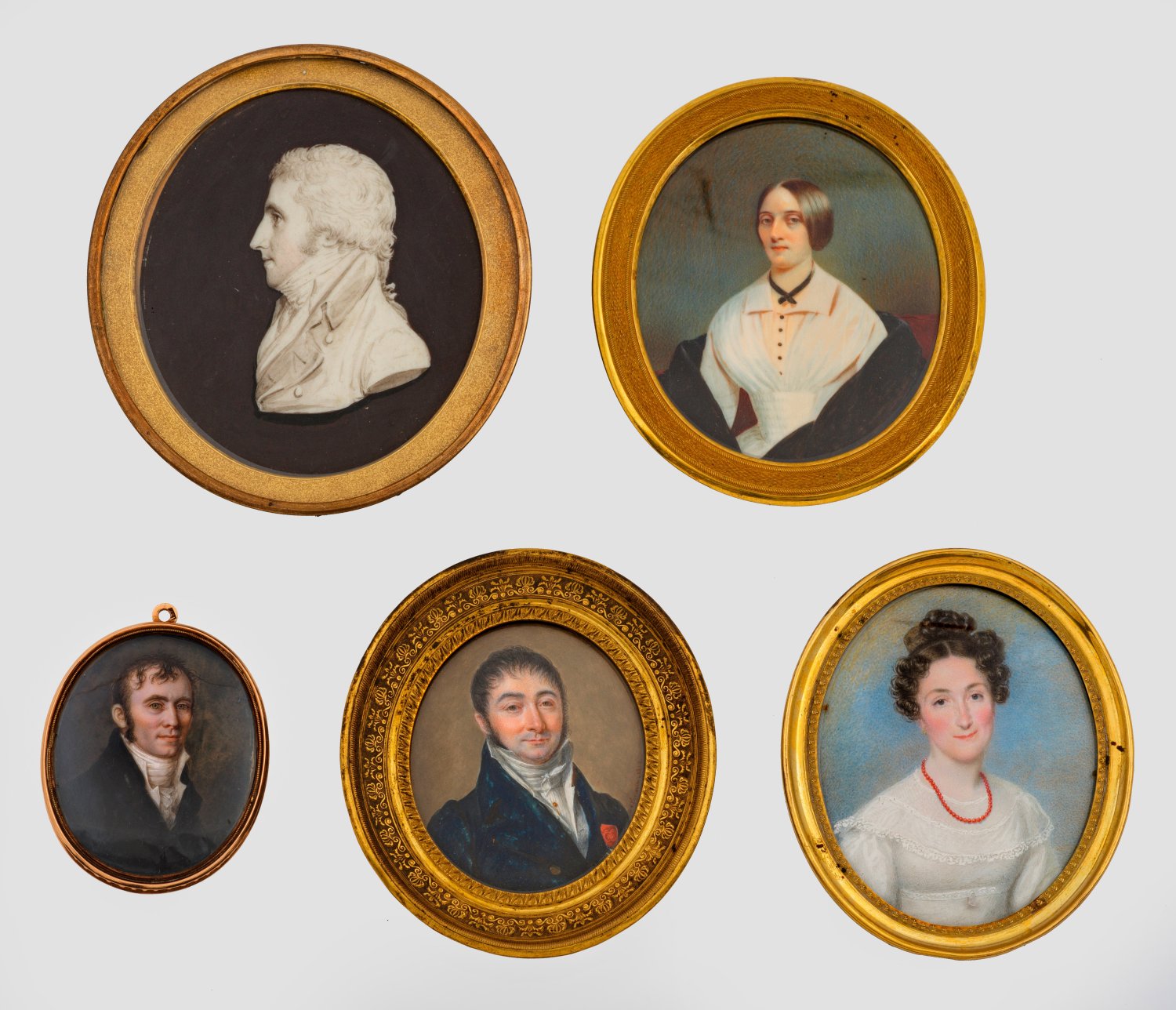 Five gouache and oil on ivory and paper miniature portraits. One portrait signed and dates "Tonna 1812". CITES included.