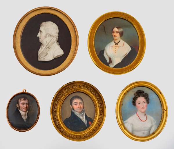5-tlg.; 4 polychrome Brustbildnisse von zwei jungen Damen in hellen Kleidern, und zwei Herren in dunklen Gehröcken sowie die Profildarstellung eines Herren in Grisaille. Ein Porträt sign. und dat. "Tonna 1812". Gouache und Öl/Elfenbein und Papier. H. 6 cm -10 cm. Rahmen.