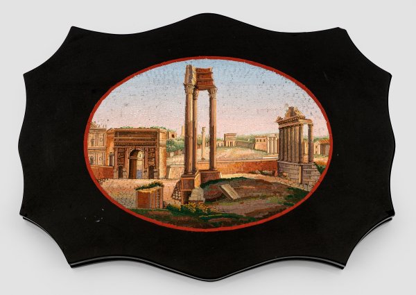 Schwarze, passig geschweifte Schieferplatte. Im Rot gerahmten Medaillon feines und detailgetreu gearbeitetes Mikromosaik mit der Ansicht des Forum Romanums. Vordergründig zur Linken der Septimus-Severus-Bogen, zentral die drei Säulen des Vespasian-Tempels sowie rechtslagig der Saturn-Tempel. H. 1,5 cm. 17,5 cm x 13 cm.