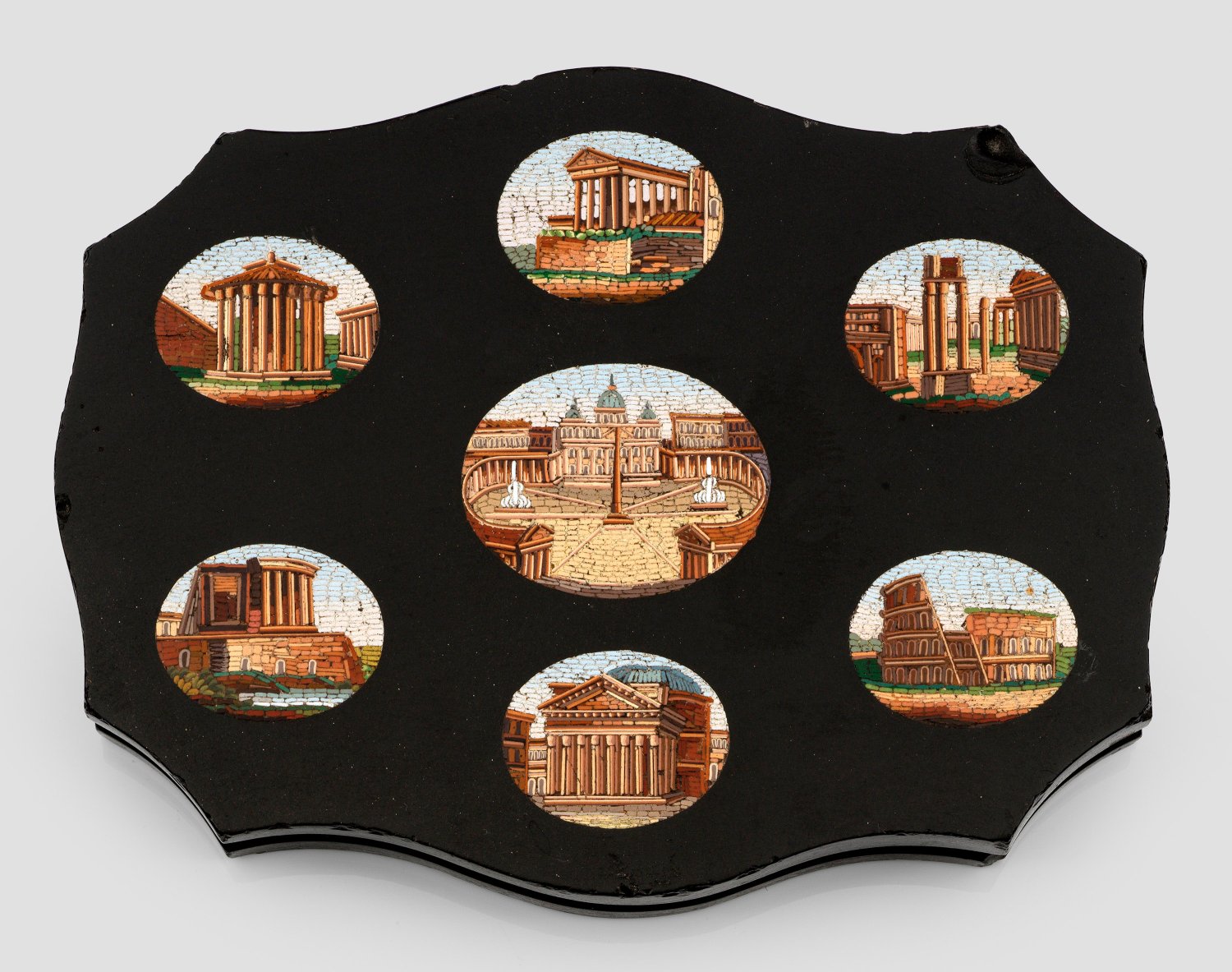 Schwarze, passig geschweifte Schieferplatte. In ovalen Medaillons 7 feine und detailgetreu gearbeitete Sehenswürdigkeiten aus Rom. Zentral Ansicht des Petersplatzes. Umlaufend die Darstellungen mit Forum Romanum, Kolosseum, Pantheon, Vesta-Tempel in Tivoli und Herkules-Tempel. H. 2 cm. 15 cm x 11,5 cm.
