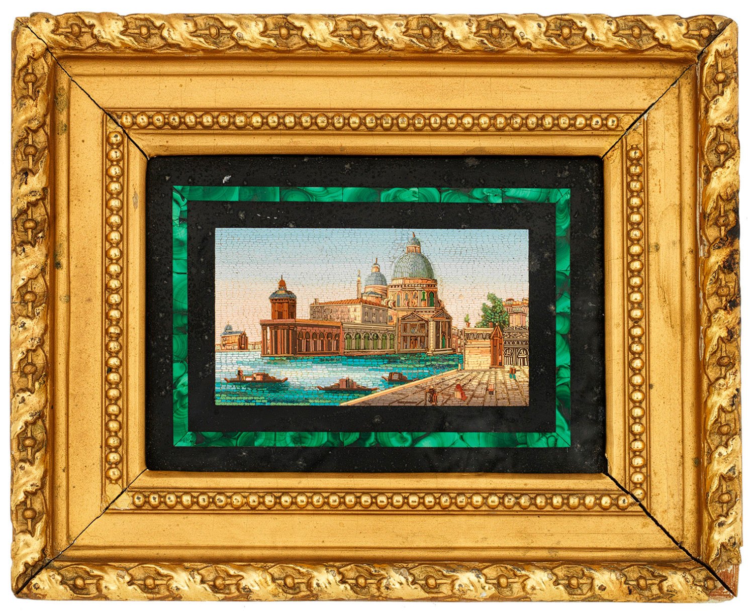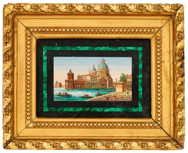 Anthrazitfarbene, rechteckige Marmorplatte. Zentrales äußerst fein und detailgetreu gearbeitetes Mikromosaik mit einer Venedig-Ansicht und Blick über die Einfahrt des Canal Grande auf die barocke Kirche Santa Maria della Salute mit Figurenstaffagen und Gondeln, gerahmt von umlaufendem, eingelegtem Malachitband in sog. Pietra-Dura-Technik. Prächtiger, vergoldeter Rahmen. Bildausschnitt 23,5 cm x 16 cm.