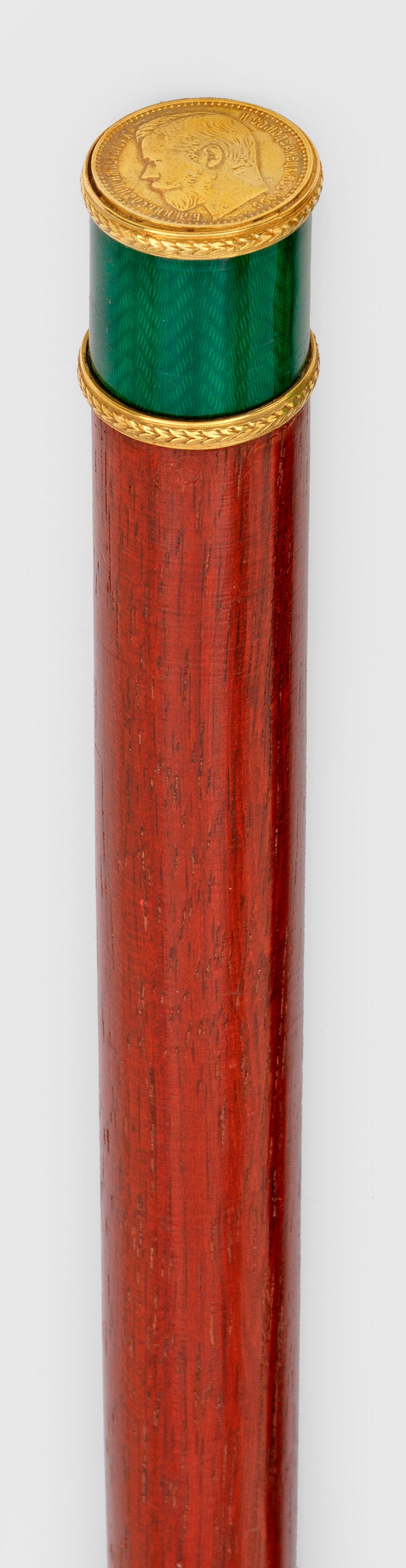 in der Art von Karl Fabergé. Silber, vergoldet, teilw. emailliert und rot lasiertes Holz. Der zylindrische Griff, umlaufend grün emailliert und fein wellenförmig guillochiert, an der Oberseite besetzt mit Rubelmünze mit Zar Nikolaus II. L. 85 cm.