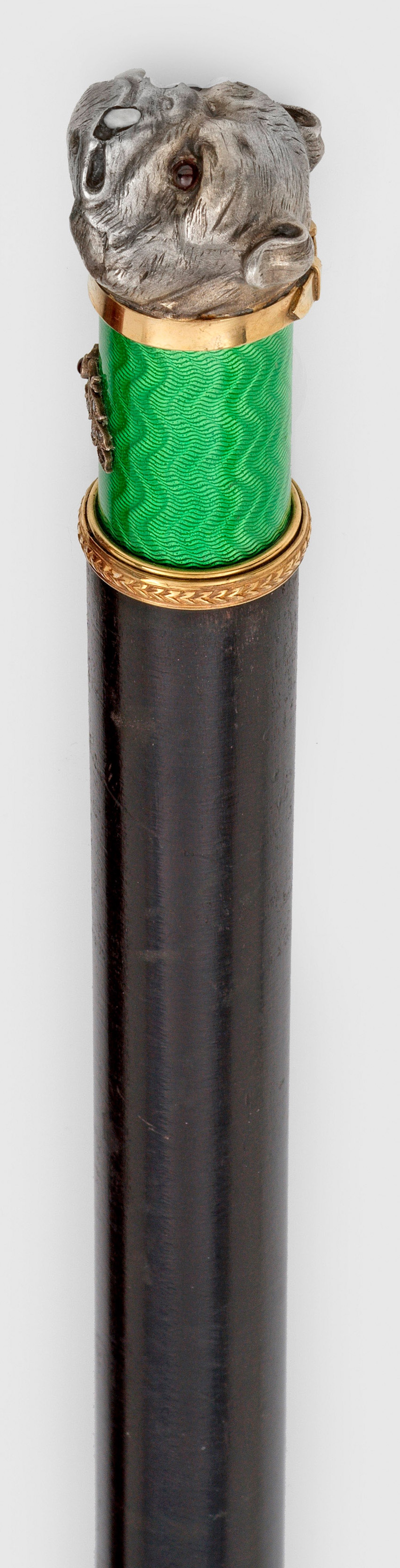 in der Art von Karl Fabergé. Teilw. vergoldete Silbermontierung. Ebonisiertes Holz. Als Knauf der vollplastische Kopf einer Bulldogge mit Halsband und roten Farbsteincabochons als Augen, über wellenförmig guillochiertem und hellgrün emailliertem Band. Gest. 84. L. 89,5 cm.