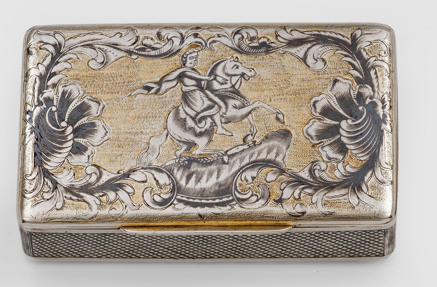 Silber, teilw. vergoldet. Rechteckiger Korpus mit Niello-Dekor in Form von Akanthusranken. Auf dem Deckel Darstellung des Reiterdenkmals Peters des Großen in St. Petersburg, auf dem Boden eine Stadtansicht mit Brücke. Gest. 84, Beschauzeichen, ungedeutetes Meisterzeichen "TT". Gew. ca. 160 g. H. 2,5 cm. 9,5 cm x 6 cm.