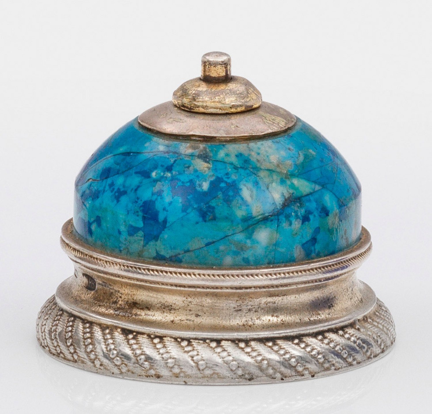 Silber, Stein. Kuppelförmige Wandung aus blau marmoriertem Stein auf von Kordelband gesäumtem Silbersockel, bekrönt von kleinem Drücker aus Silber. Elektrifiziert. Gest. 88. H. 4 cm. D. 5 cm.