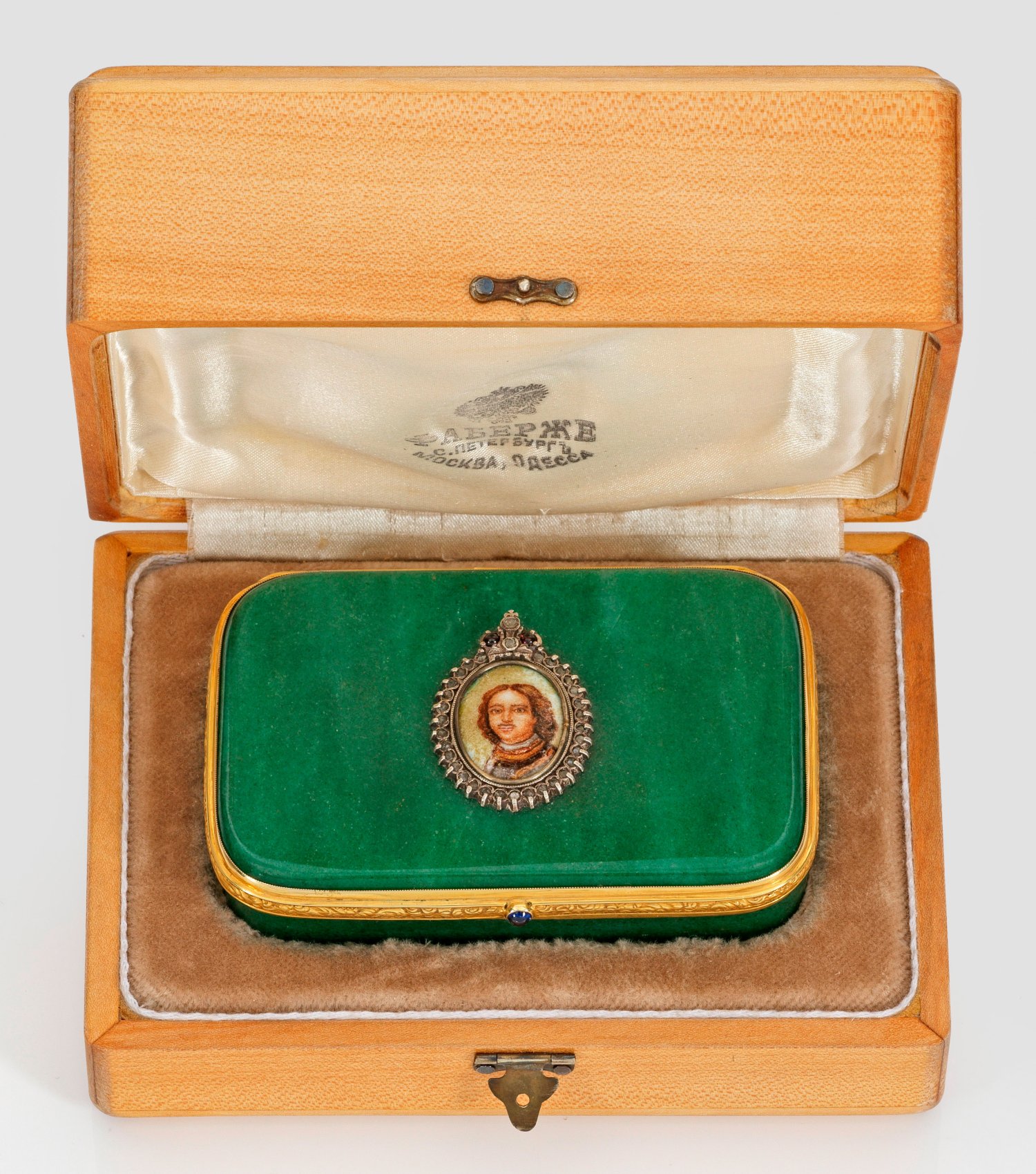 im Stil von Karl Fabergé. Grüner Aventurin, Silber, teilw. vergoldet. Flache, rechteckige, in den Ecken abgerundete Form mit fein graviertem Scharnierdeckel. Zentral ein appliziertes Medaillon mit Brustbildnis von Peter dem Großen, gerahmt von Diamantrosen und zwei Granatcabochons. Original Box. Gest. 88.; H. 2,2 cm. 9 cm x 6 cm