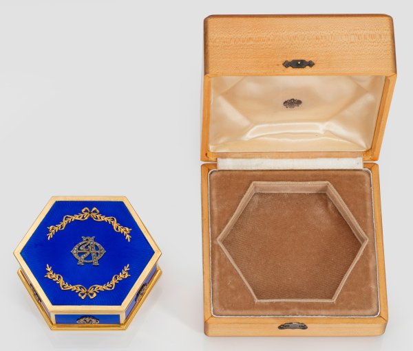 im Stil von Karl Fabergé. Mit Holzetui. Silber, vergoldet und emailliert. Sechsfach gekanteter Korpus mit gerader Wandung und gering ausgestelltem, gestuftem Stand und Deckelrand. Wandung und scharnierter Deckel royalblau emailliert über fein guillochiertem, strahlenförmigem Grund. Auf dem Deckel zentral appliziertes, kyrillisches Monogramm ausgefasst mit Diamantrosen, gerahmt von Lorbeerzweigen. Die Wandung verziert mit stilisierten Zierschalen über volutierten Akanthusblättern. Gest. 88. Gew. ca. 370 g. H. 3,4 cm. 9,2 cm x 9,2 cm.