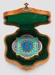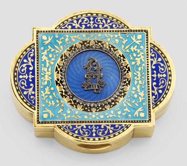 Zierdose im Stil von Karl Fabergé. Silber, vergoldet und teilw. emailliert. Rechteckige, an den Seiten von Vierpass überschnittene Grundform mit glatter, gerader Wandung. Deckel hellblau und dunkelblau emailliert mit goldenem Blüten- und Volutendekor sowie schwarz emaillierten Zierfriesen um die Ränder. Zentral applizierte, runde, von kleinen Diamantrosen gerahmte Mittelkartusche mit aufgelegtem, ligiertem Monogramm von Zar Alexander III. (1845-1894). Mit Etui. Minim. best./rest.; Gest. 88. Gew. ca. 280 g. H. 2,8 cm. 10,5 cm x 9 cm.