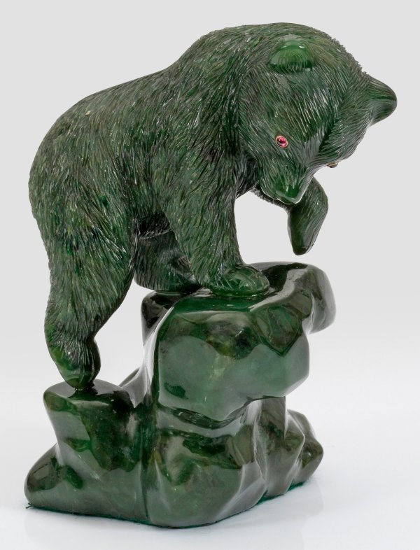 im Stil von Karl Fabergé. Nephrit mit silbergefassten roten Granatcabochons als Augen. Auf hohem, geschliffenen Terrainsockel in Form mehrerer aufgetürmter Felsbrocken ein schreitender, nach rechts gewandter Bär mit erhobener Vordertatze. Durch kleine Schnitte naturalistisch wiedergegebenes Fell. H. 12 cm. 8 cm.