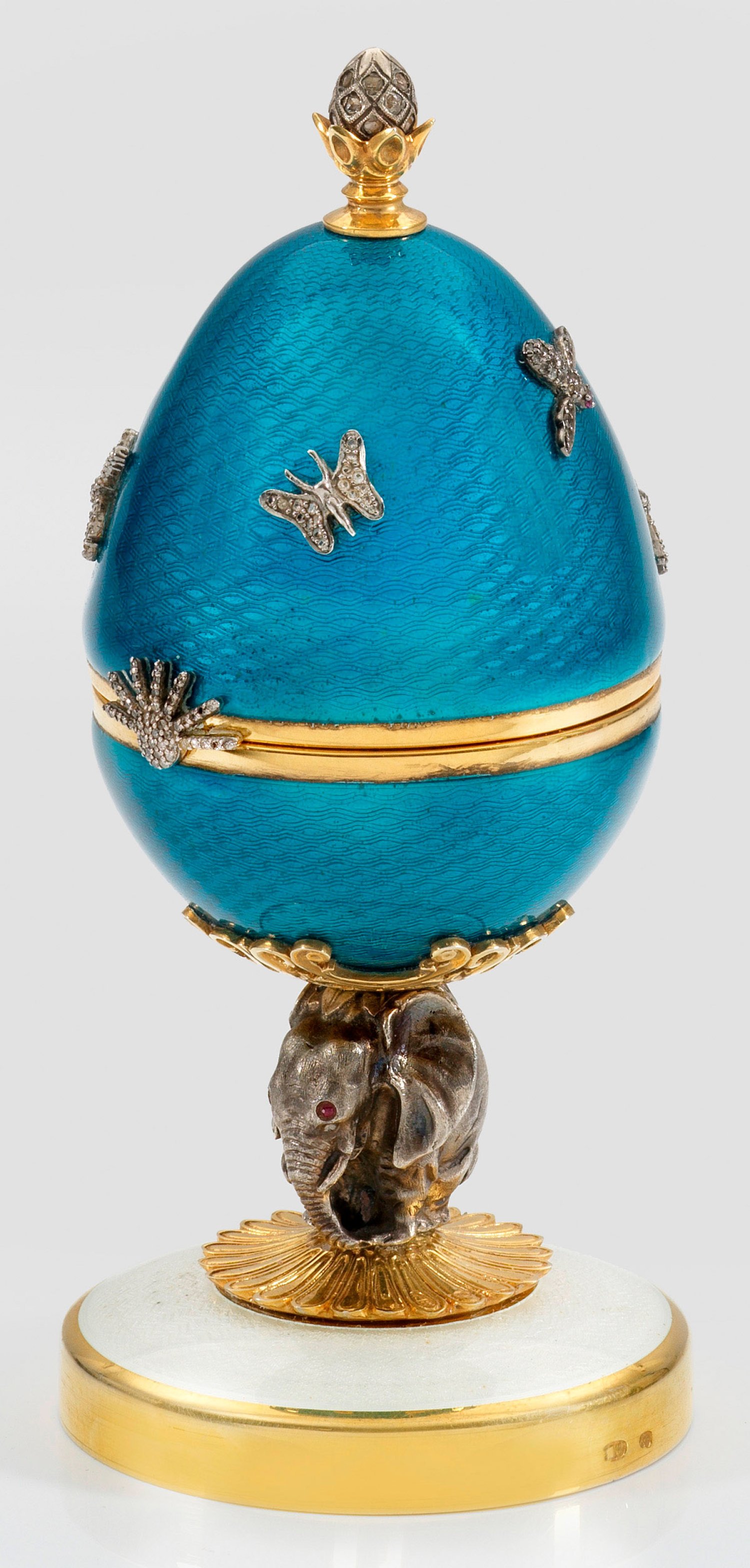 im Stil von Karl Fabergé. Silber, teilw. vergoldet und emailliert. Runder, weiß emaillerter Sockel mit in blütenförmiger Applikation ansetzendem Schaft in Form eines naturalistisch gearbeiteten Elefanten mit roten Farbcabochons als Augen. Ovoider, im unteren Drittel scharnierter Korpus in Form eines prunkvoll gestalteten Eies. Flächendeckend türkisblau emailliert über wellenförmig guillochiertem Grund. Der Korpus mit üppigen Applikationen in Form von Schmetterlingen, Bienen und Libellen besetzt mit Diamantrosen. Als Deckelbekrönung ein Pinienknauf in einer vergoldeten Krone. Gest. Kokoschnik 88. Gew. ca. 330 g. H. 12,5 cm. D. 5,5 cm.