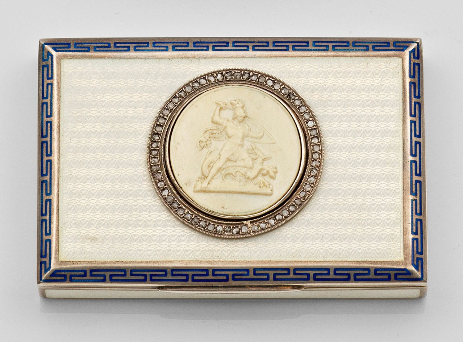 im Stil von Karl Fabergé. Silber, teilw. emailliert. Rechteckig mit leicht aufgewölbten Scharnierdeckel, gerahmt mit blauem Mäanderband und zentral besetzt mit Bakelit-Applikation des Hl. Georgs, gerahmt von Silberband, ausgefasst mit Diamantrosen. Deckel, Wandung und Boden weiß emailliert über wellenbandförmig guillochiertem Grund. Gest. 88. Gew. ca. 180 g. H. 2 cm. 9 cm x 6 cm.