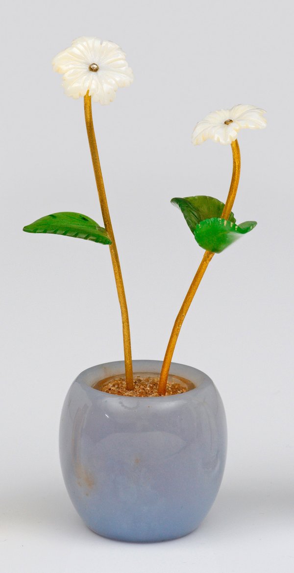 in der Art von Karl Fabergé. Achat und Silber, vergoldet. Konischer Topf aus hellblauem Achat mit zwei einsetzbaren, schmalen Blütenstängeln, bekrönt von einer Blüte aus weißen, geschliffenen Steinen. Gest. 88. H. 12,5 cm.